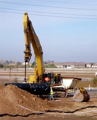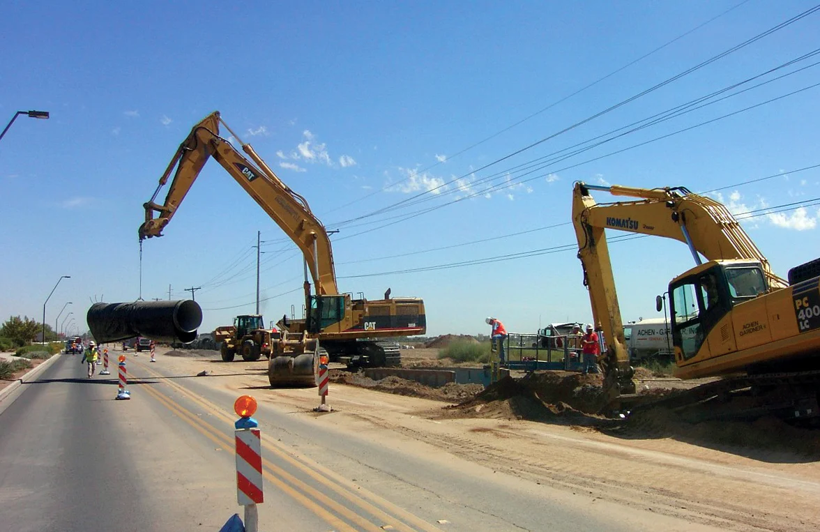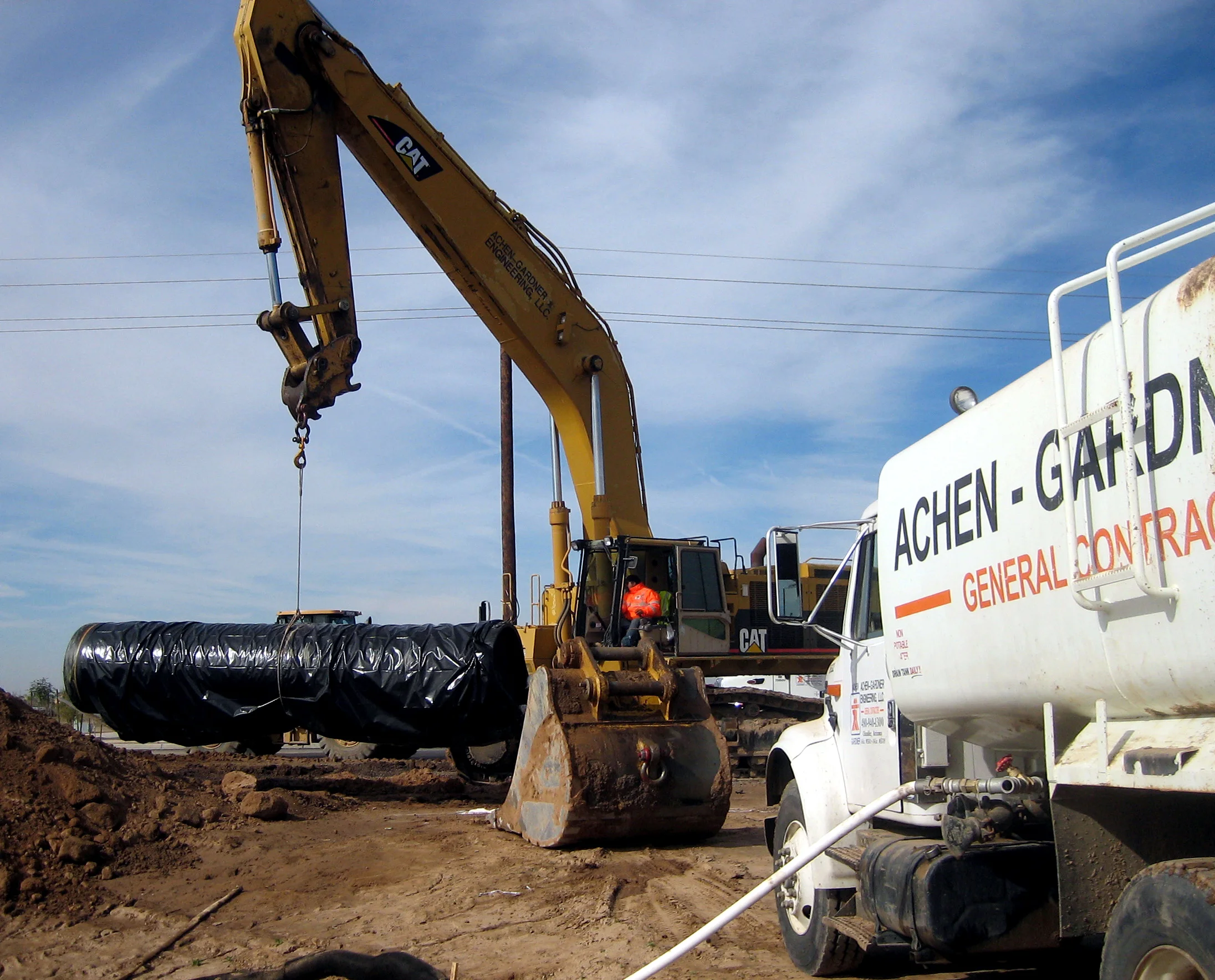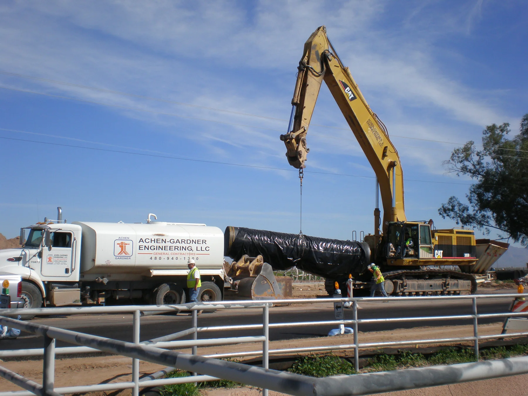 This project included design, procurement, and construction for 13.5 miles of 48-inch raw water pipeline. Its purpose is to convey water from the CAP Canal turnout structure (Ocotillo Road east of Schnepf Road) to the new South Water Treatment Plant (just west of the intersection of Recker Road and Ocotillo Road).